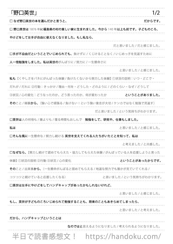 ※マンガ伝記を読んでも、活字の伝記を読んでも野口英世の感想文は書けます!